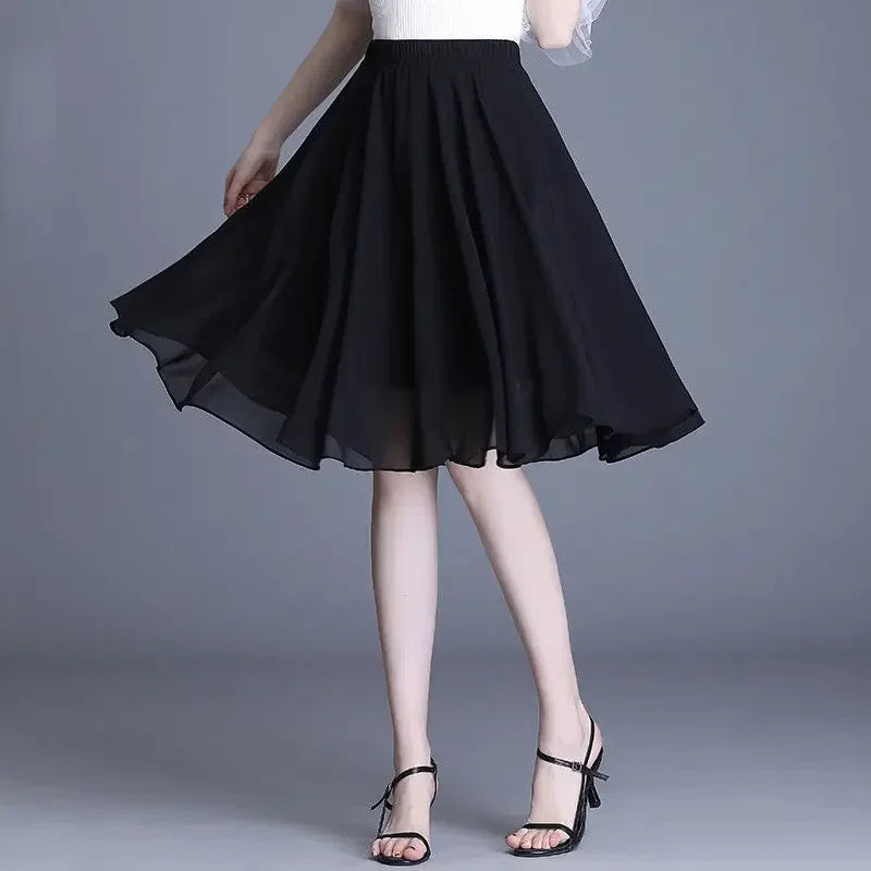 Stay breezy and stylish with this women’s black chiffon A-line mini skirt, designed with a flattering high waist and soft draped silhouette. Perfect for summer, its half-length umbrella cut adds elegant movement and comfort. This versatile skirt is ideal for both casual and dressy looks.