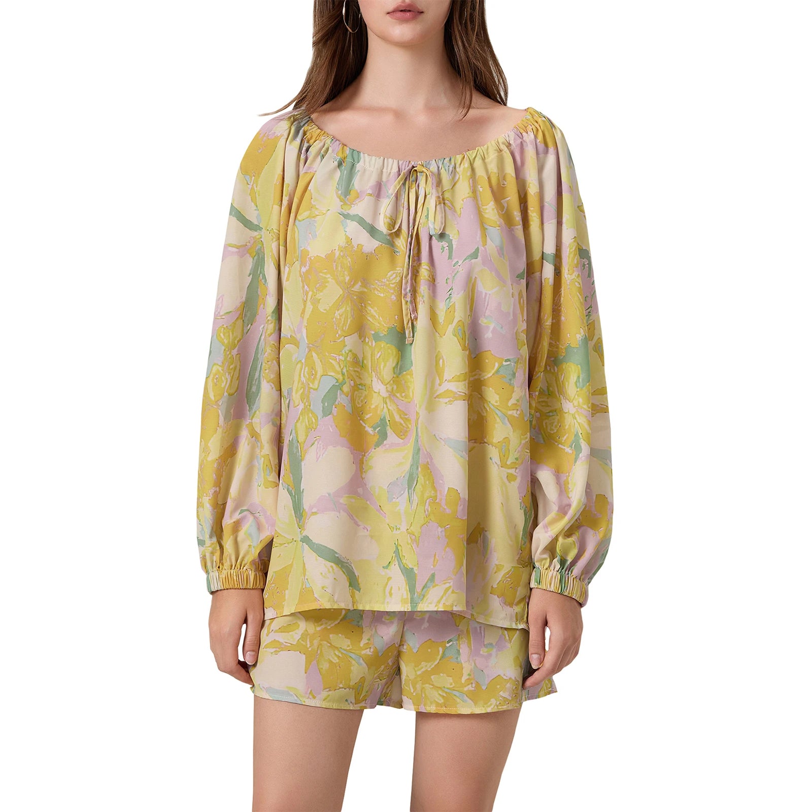 Elevate your summer style with this Elegant Floral Ensemble featuring a long sleeve blouse with delicate tie-up details and matching elastic waist shorts. Perfect for a chic and comfortable look, this set combines feminine prints with a flattering fit. Lightweight and breathable, it’s ideal for warm-weather outings and casual elegance.