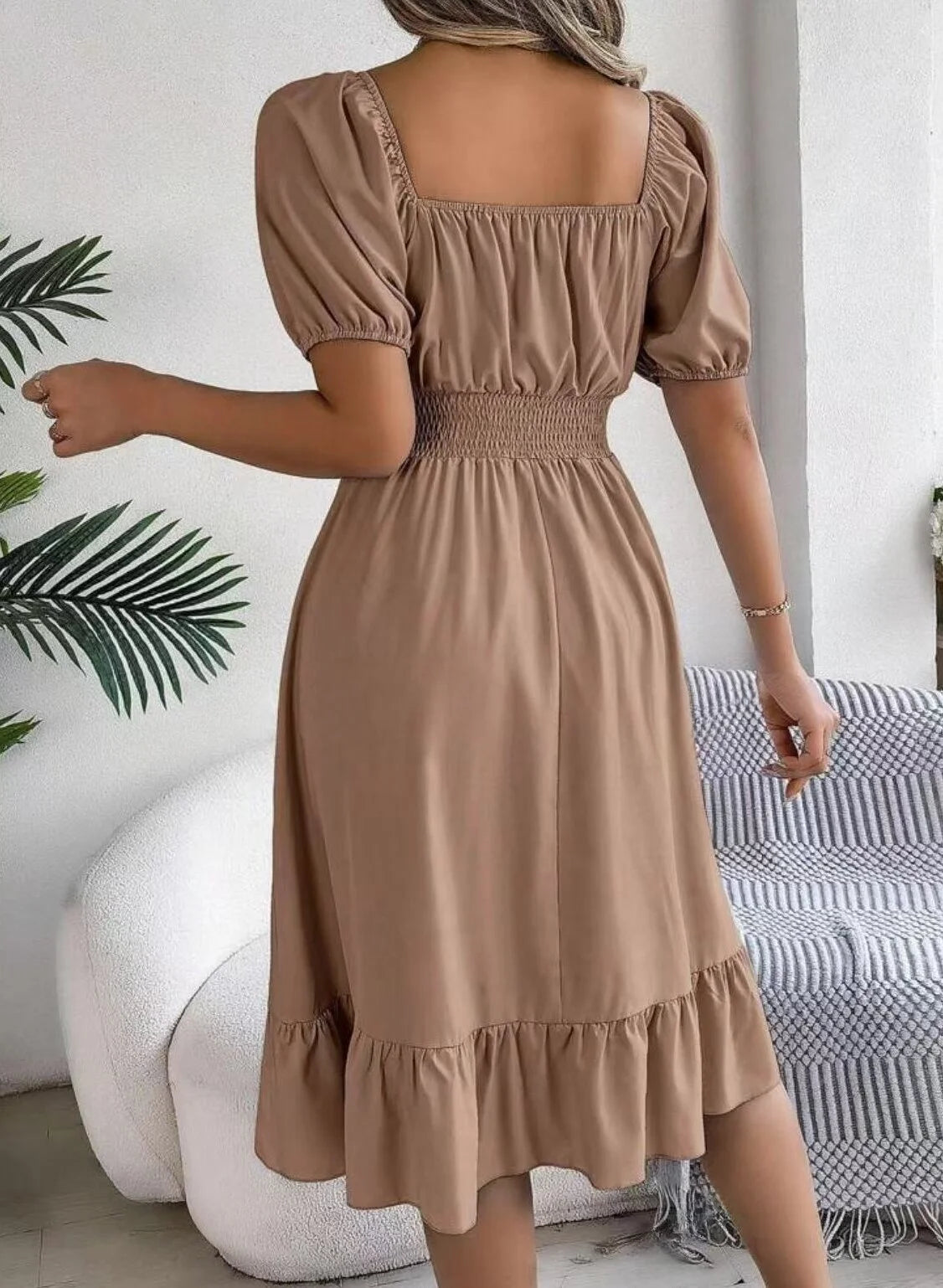 Step into spring and summer with this European and American-inspired Casual Dress featuring a chic square neckline and short sleeves. The gathered waist and lotus leaf edge add a touch of elegance and feminine charm. Perfect for warm-weather outings, it combines comfort with timeless temperament style.
