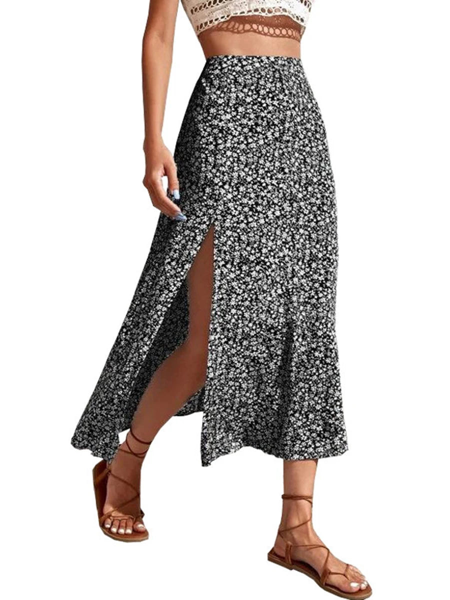 Step into spring and summer with this women’s floral print midi skirt, featuring a flattering mid waist and stylish side slit. The casual A-line silhouette offers comfort and movement for everyday wear. Perfect for warm-weather fashion, this chic skirt blends feminine charm with easy elegance.